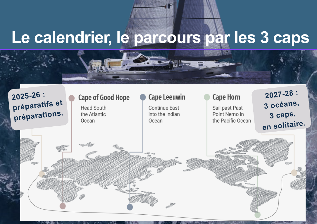 Cette route reste une aventure exceptionnelle. Il y a moins de marins ayant franchi le Cap Horn en solitaire sur un tour du monde que d’astronautes partis dans l’espace. Sur un bateau offshore robuste, autour d’un projet unique, qui va résoner, nous allons nous inscrire dans l'enthousiasmante histoire des Tours du Monde à la voile. C'est toute une organisation qui se met en place avec une équipe à terre pour le marin, pour le bateau et pour la pédagogie. Tous ensemble pour être à hauteur de l’évènement.