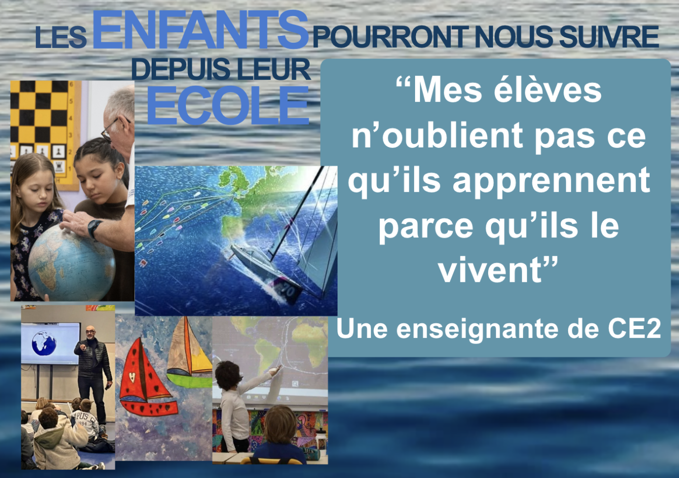 Un marin engagé en classe, un directeur d’école en mer. Ex-enseignant et directeur d’école élémentaire, il s’engage dans un tour du monde en solo , mais pas en solitaire : Il emmène avec lui des élèves, des enseignants et leur classe.