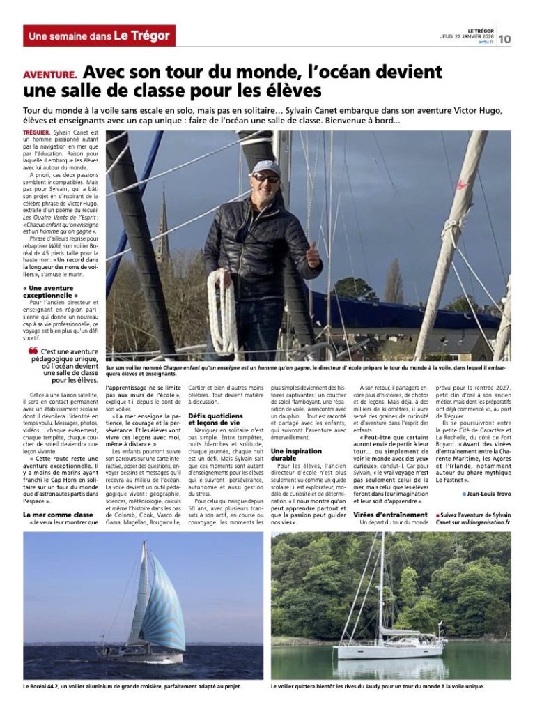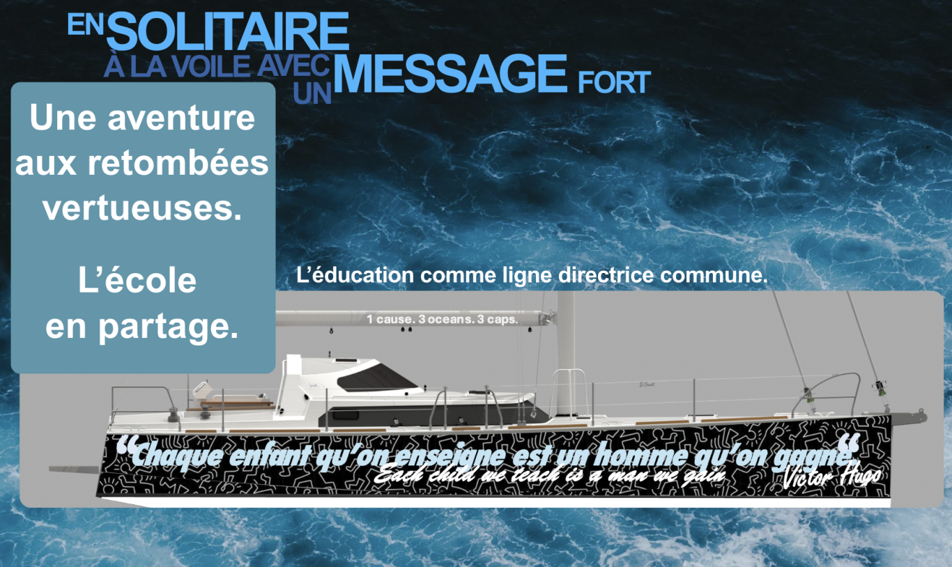 Wild, voilier taillé pour la haute mer, portera la citation célèbre du grand homme universellement connu et reconnu, Victor Hugo : "Chaque enfant qu'on enseigne est un homme qu'on gagne"